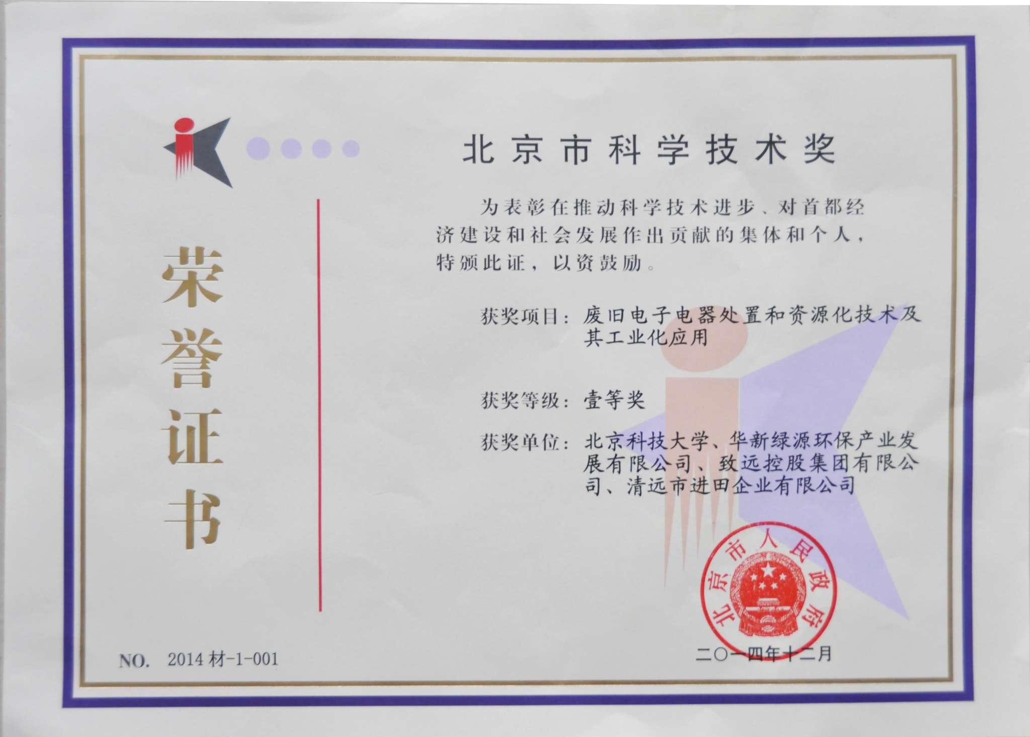 作為項(xiàng)目組成員,華新綠源環(huán)保產(chǎn)業(yè)發(fā)展有限公司研發(fā)的“廢舊電子電器處置和資源化技術(shù)及其工業(yè)化應(yīng)用項(xiàng)目”榮獲北京市科學(xué)技術(shù)一等獎(jiǎng)。